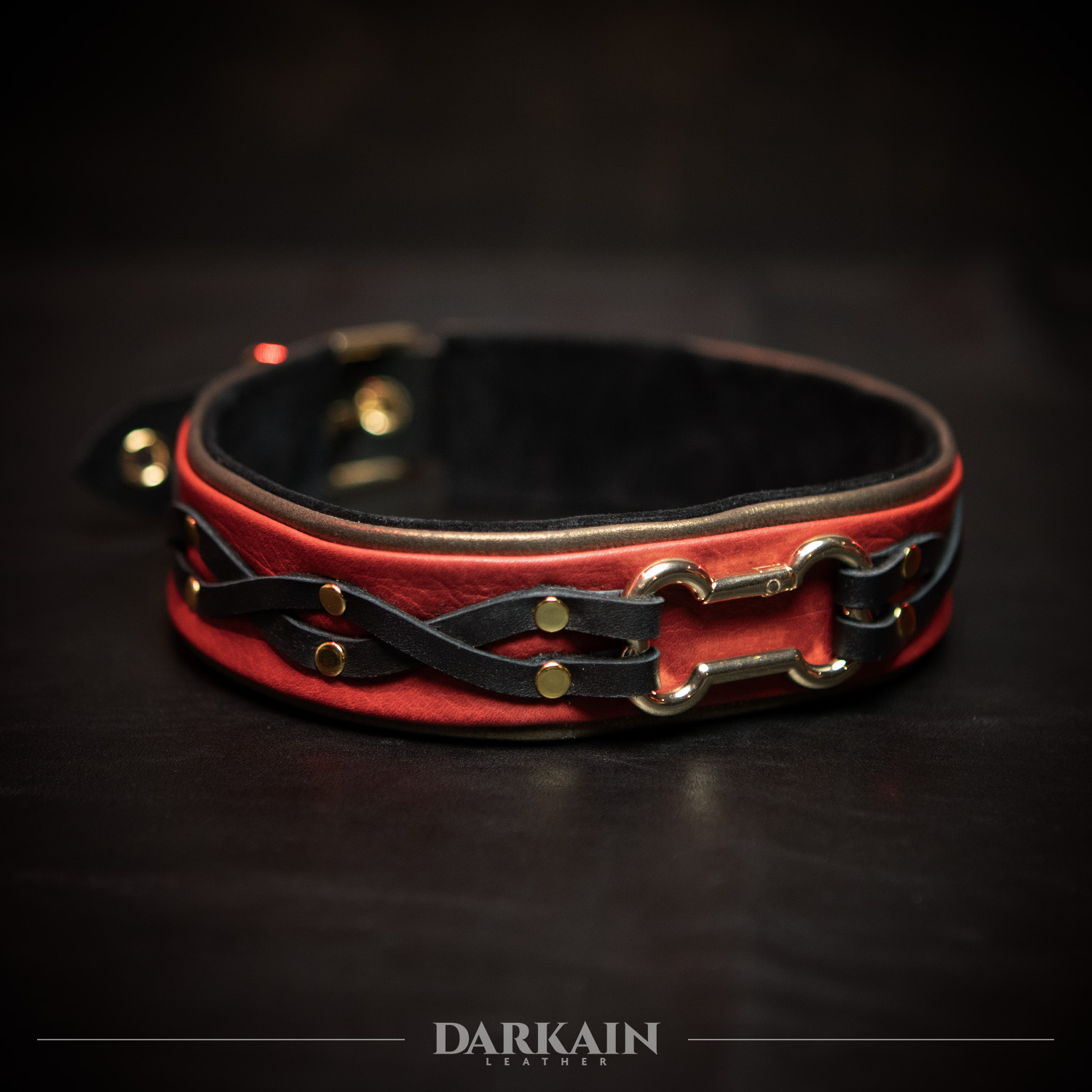 Crafted from rich red leather with a braided black leather detail, this pup collar blends comfort with control. Golden rivets secure the braid, adding strength and contrast, while the smooth interior keeps it wearable for extended use. Designed to sit cleanly at the neck, it is made for pups who value connection, structure, and quiet confidence.