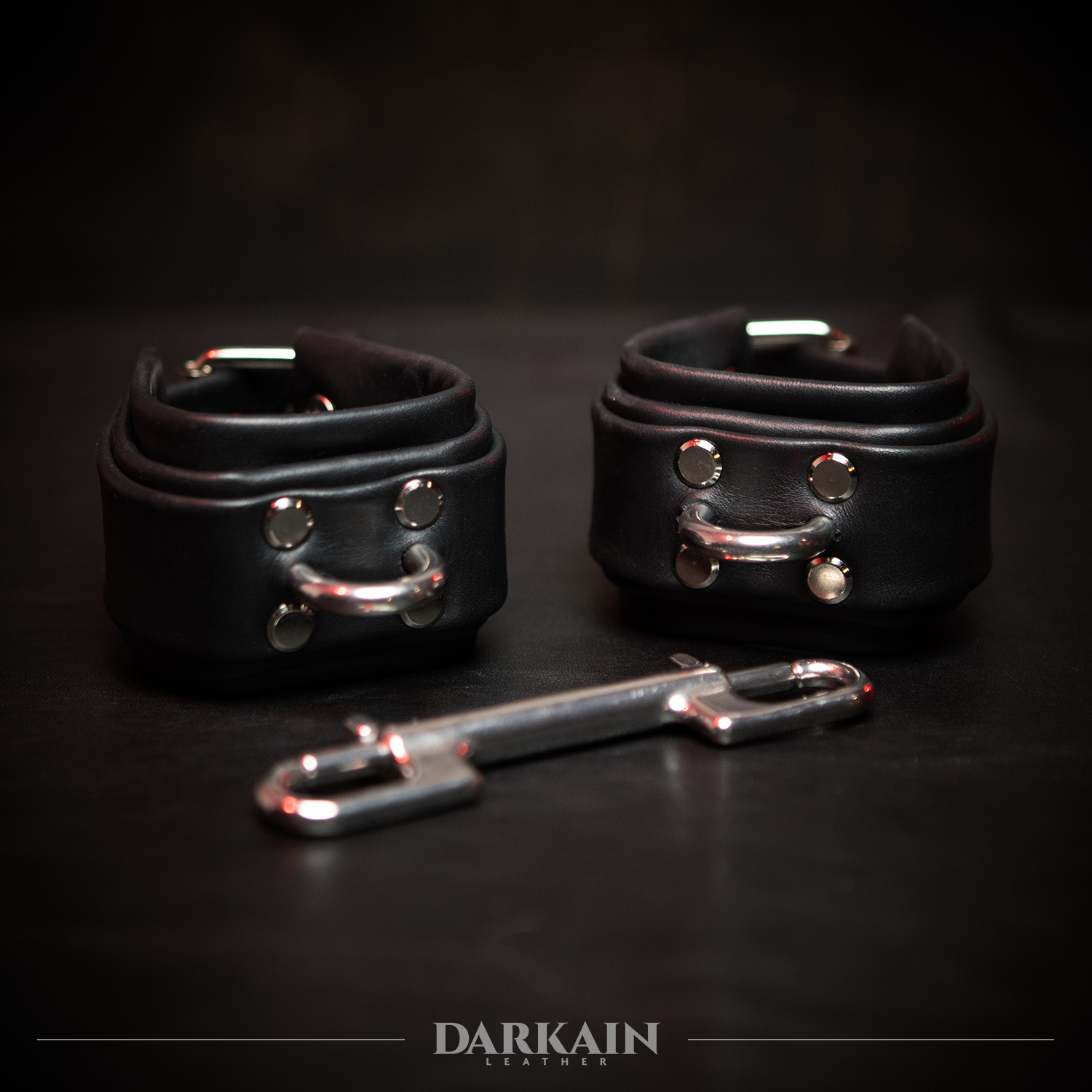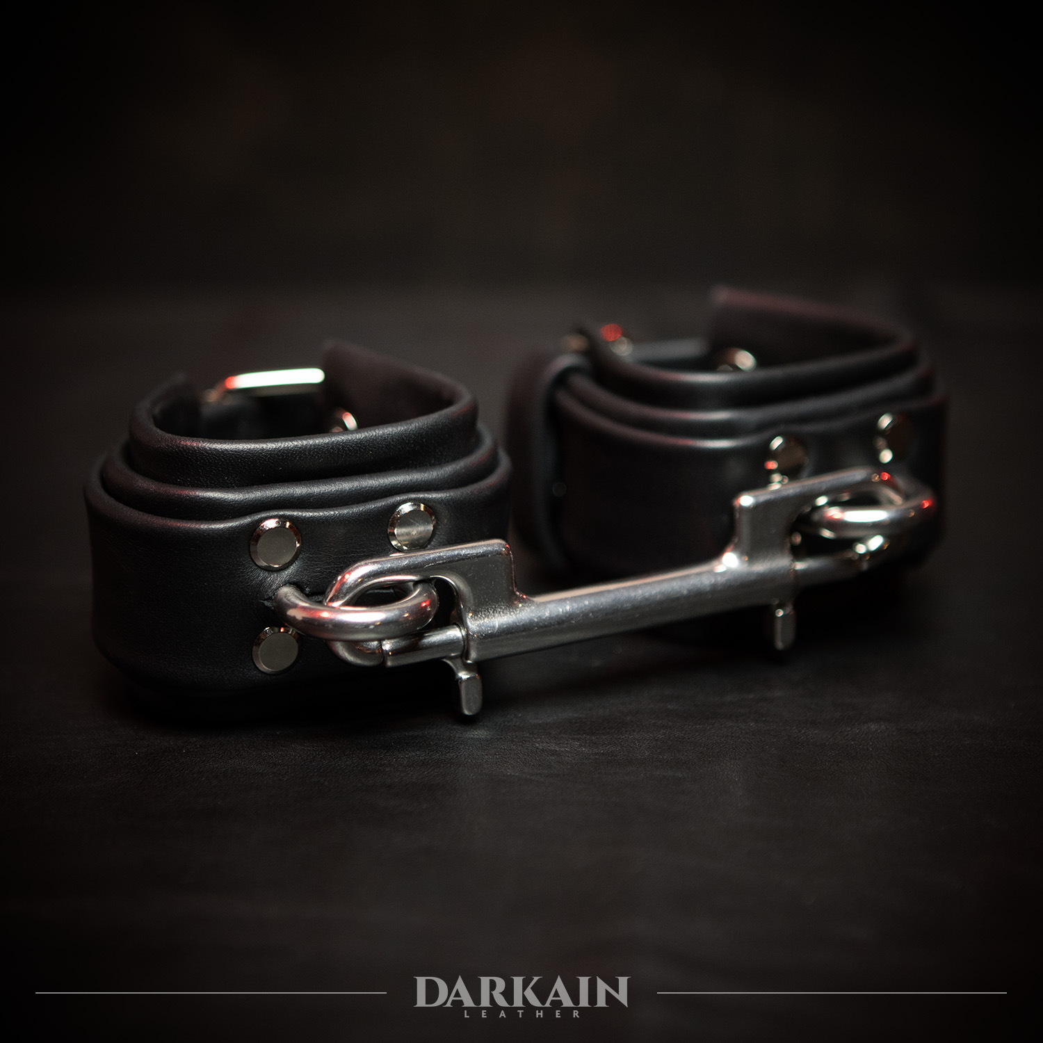 Built from thick black leather with heavy polished steel hardware, Holdfast Cuffs are made for uncompromising restraint. Wide, reinforced bands lock the wrists or ankles into position, while the rigid central bar keeps movement limited and deliberate. Every element is designed to hold fast, apply pressure, and assert control without softness. These cuffs are for scenes that demand force, certainty, and complete authority.