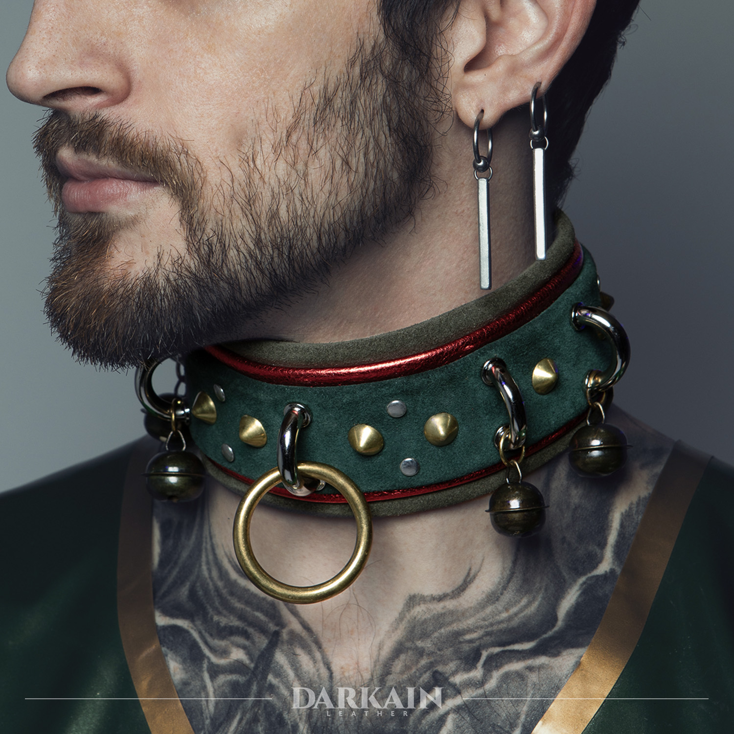 Built for the sub who knows how to serve with style, this collar brings holiday heat with a bold, handcrafted design. Deep green suede and matching leather create a sturdy, comfortable body that sits solid around the neck. Metallic red trim adds a sharp festive edge while the brass studs and heavy duty hardware give it a powerful, masculine presence.